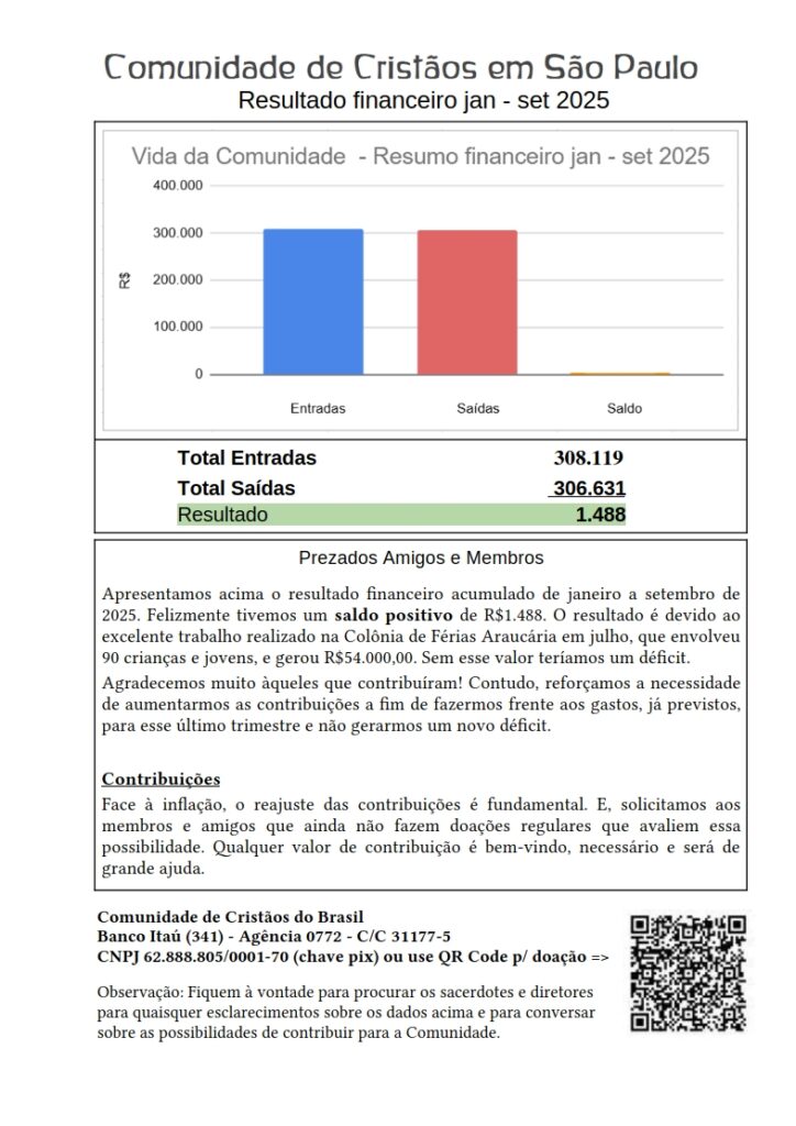 Queremos voltar o nosso olhar para as atividades da comunidade neste ano e assim formarmos uma consciência da situação financeira atual.