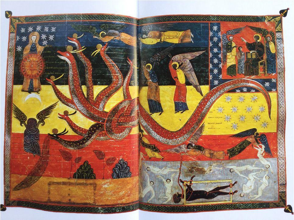 Esse momento é apresentado aqui em relação ao acontecimento representado no fundo à esquerda, a expulsão de Adão e Eva do Paraíso – Eva tendo havido sido retirada por Deus do lado de Adão durante o seu sono inconsciente.