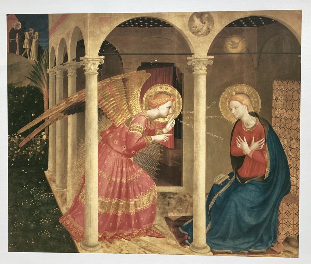 Nessa bela obra de Fra Angélico representando a anunciação do nascimento de Jesus, o Anjo Gabriel, em toda a sua dinâmica direcionada à Maria, nos gestos das suas mãos, nas suas palavras representadas pela escrita em ouro, manifesta a decidida intenção do mundo espiritual de revelar o processo de concepção à consciência da futura mãe. Isso implica em um completo envolvimento e ligação com o novo ser anunciado. As metas espirituais anunciadas à consciência humana são sempre um grande desafio, porque ainda devem ser a todo custo realizadas. As asas do anjo Gabriel não cabem completamente na morada de Maria; ela ainda tem que aceitar sem condições a sua missão. Ela reconhece que o seu corpo e a sua existência terrena são um instrumento para a revelação do mundo espiritual. Depois do susto e temor, ela pôde aceitar incondicionalmente com as palavras: “Eis a serva do Senhor, faça-se em mim segundo a tua palavra.”