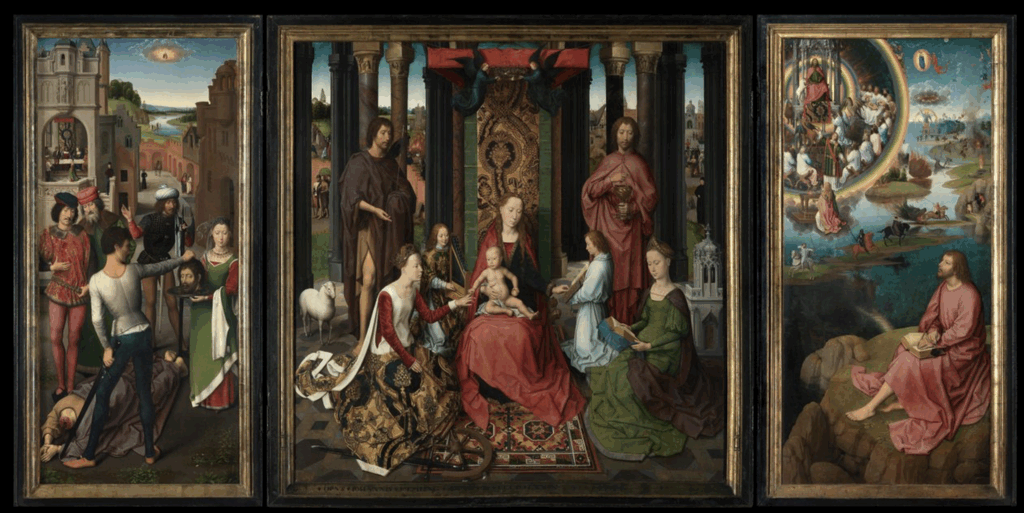 Tríptico de Hans Memling (1479) para a igreja anexa ao hospital Sint-Janhospitaal em Bruges, Bélgica. Tema: O casamento místico com o menino Jesus – segundo o sonho de Santa Catarina (à esquerda, ao pé de Maria na imagem central).