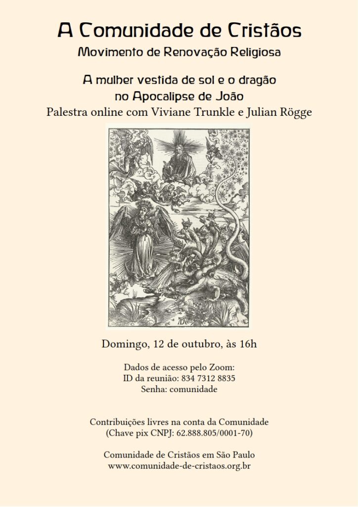 outubro 12, 2025 por A mulher vestida de sol e o dragão no Apocalipse de João 12/10/2025 16:00 - 17:30 Ingressar na reunião Zoom https://us06web.zoom.us/j/83473128835?pwd=XNBveXjeelZAf9YDo4APuZgyo4qgSI.1 ID da reunião: 834 7312 8835 Senha: comunidade Navegação de Posts ← Concerto Música Rara – nova data! Ato Dominical de Consagração do Homem →