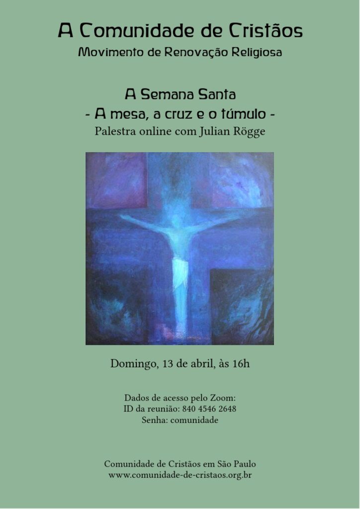 abril 13, 2025 por A Semana Santa – A mesa, a cruz e o túmulo 13/04/2025 16:00 - 17:30 Ingressar na reunião Zoom https://us06web.zoom.us/j/84045462648?pwd=ZNvdlQv1KV9oaS91bPxxuP1qbMtOHH.1 ID da reunião: 840 4546 2648 Senha: comunidade Navegação de Posts ← Concerto MúsicaRara Judas, Pilatos, João, Maria e Maria Madalena →